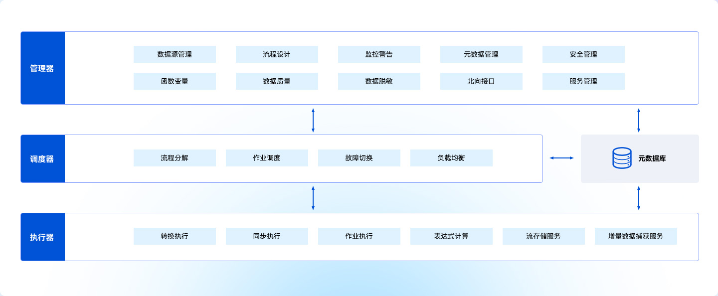 DMDIS 采用多節(jié)點(diǎn)集群架構(gòu),系統(tǒng)主要分為管理器、調(diào)度器、執(zhí)行器和元數(shù)據(jù)庫(kù)四部分,各部分功能如下圖所示: